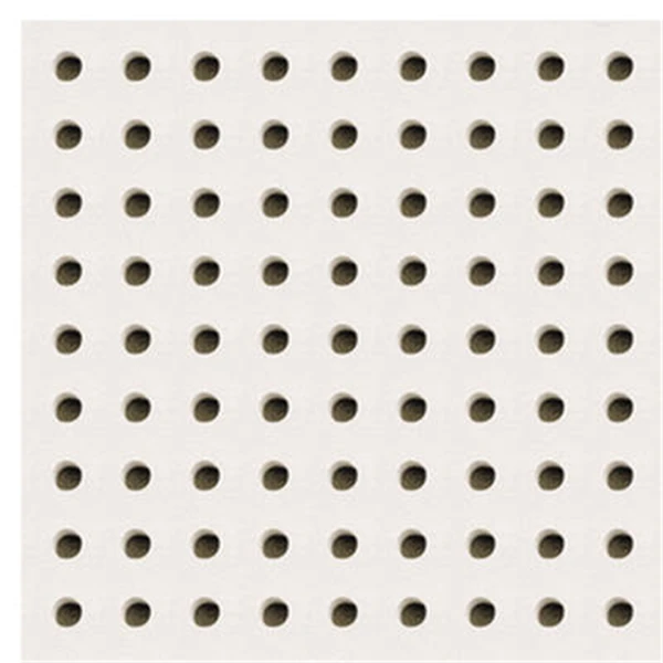 Plaque de plâtre Cleaneo® conforme à la norme NF EN 14190, avec perforations rondes Ø 8 mm en continu sur la totalité de la plaque. Elle comporte au dos un voile acoustique pour assurer l’absorption acoustique.