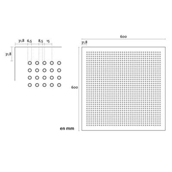 Dalle en plaque de plâtre peinte lisse et à perforations rondes et régulières, permettant la neutralisation des principaux composés organiques volatifs (COV).